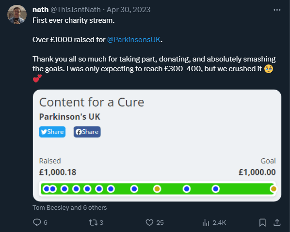 So, I challenged myself to raise £500 for Parkinson's UK via a Twitch stream, many donation goals, and community events.