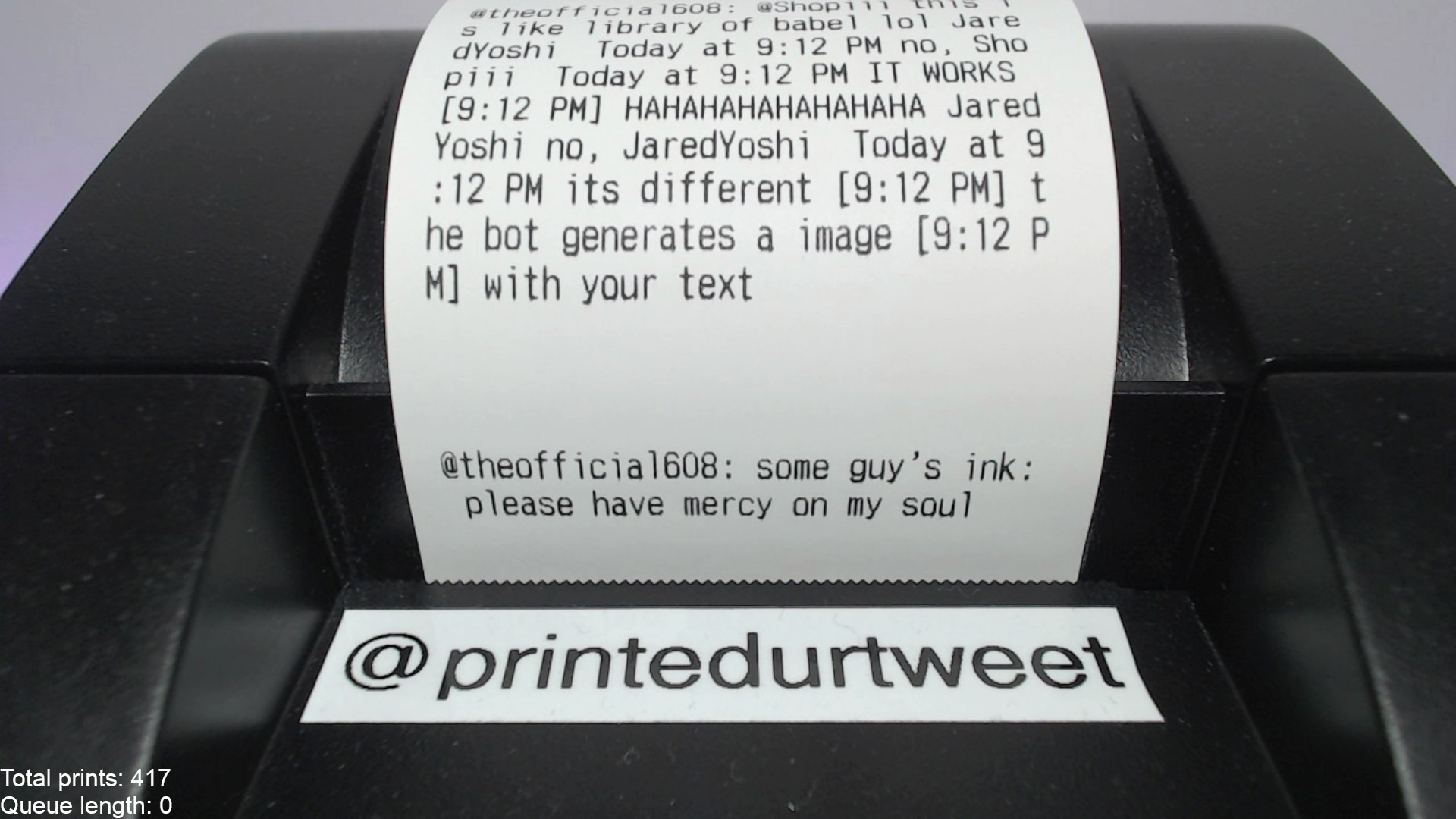 I reached out to a friend online to code an app that does exactly what we need - receive a tweet with #printmytweet, send it to the printer, snap a picture of the print with a Logitech C922 webcam, and send that pic back to the tweet author.